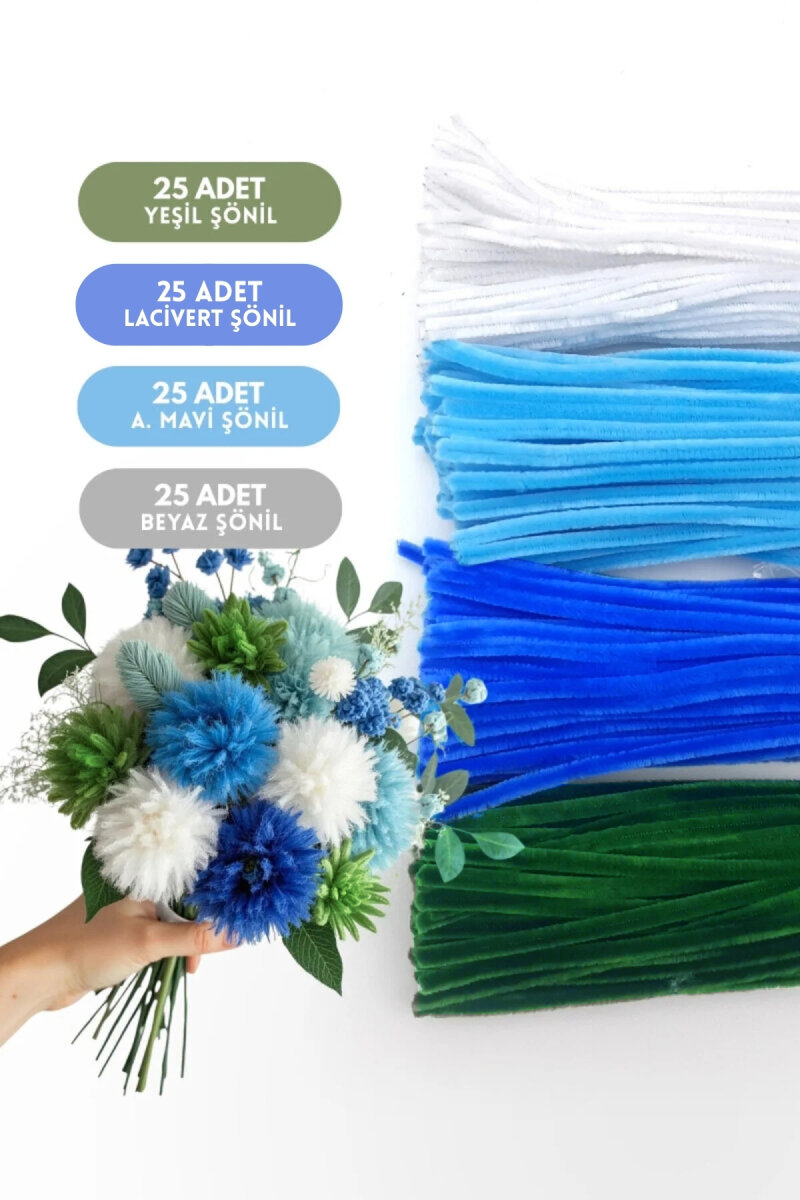 100lü tüylü tel şönil, 30 cm (25'er adet Yeşil, P. Mavi, A. Mavi, Beyaz Şönil, Çiçek Yapımına Uygun)