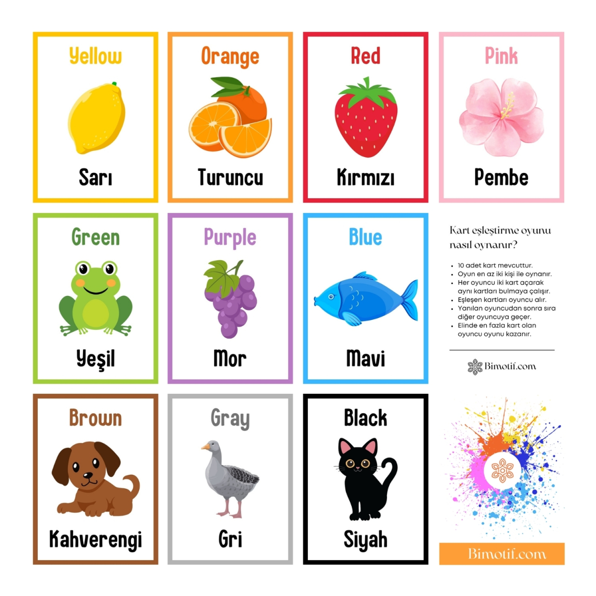 10lu ingilizce eğitici hafıza kartı oyunu, Renkli Hayvan ve Meyveler (Bağcıklı Kumaş Keseli)