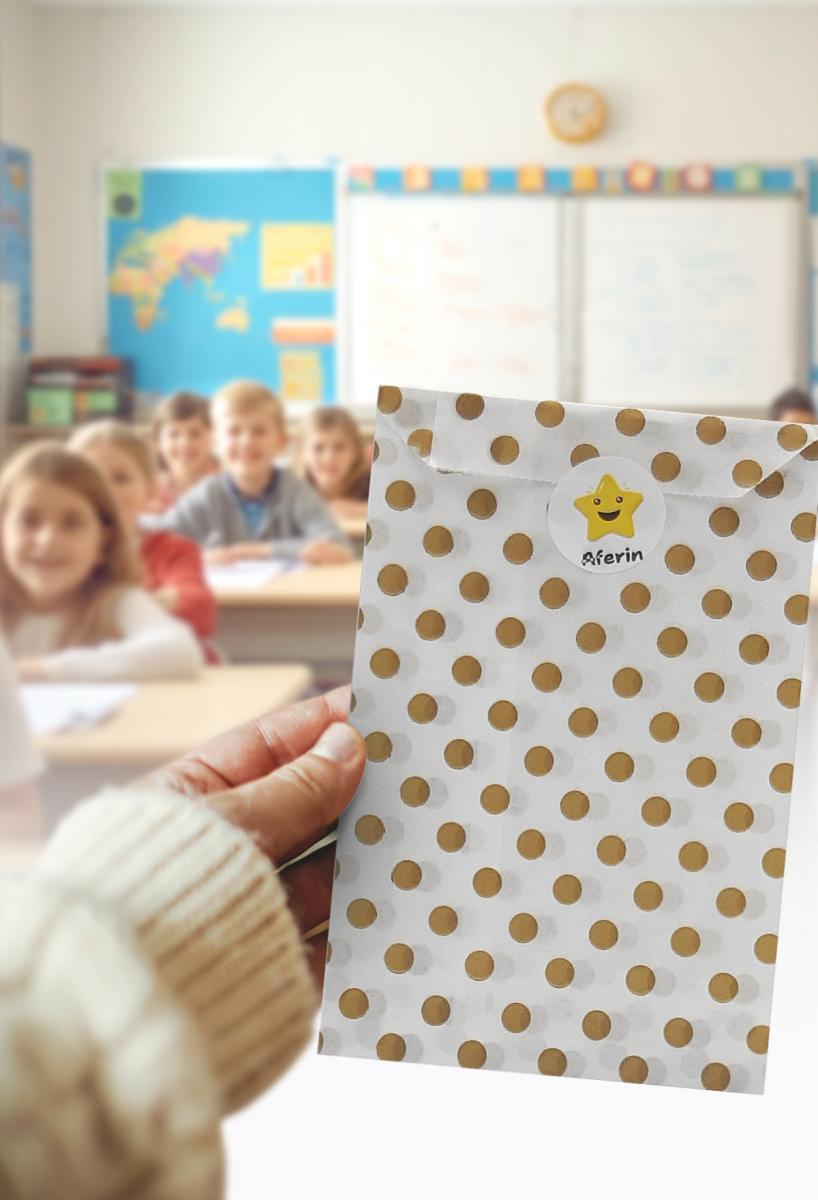 21 parça öğrenci hediye paket seti (20 adet 11x20 cm kese kağıdı ve 1 sayfa sticker)