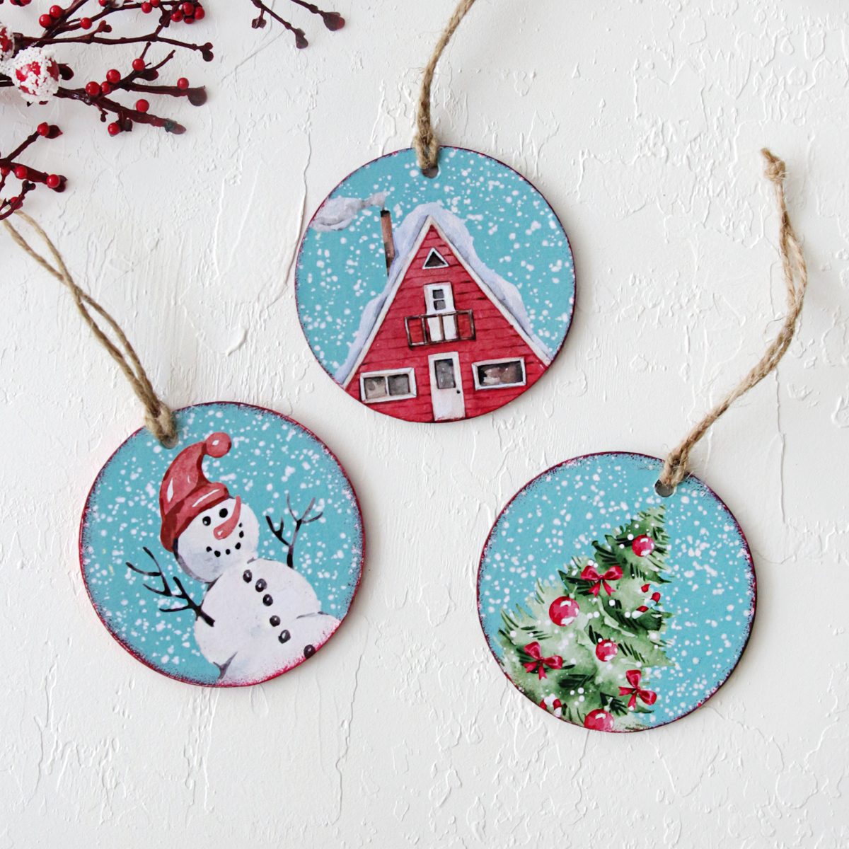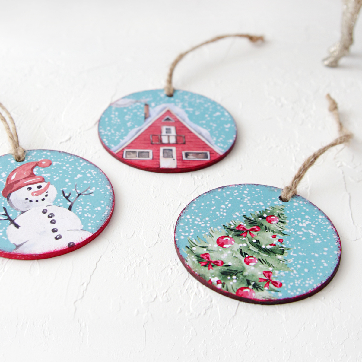 3lü ahşap yılbaşı süsü. Ürünün çapı 7 cm'dir. Fiyat 3 adet süs içindir. Fotoğraftaki ip, dekoratif amaçla kullanılmıştır.