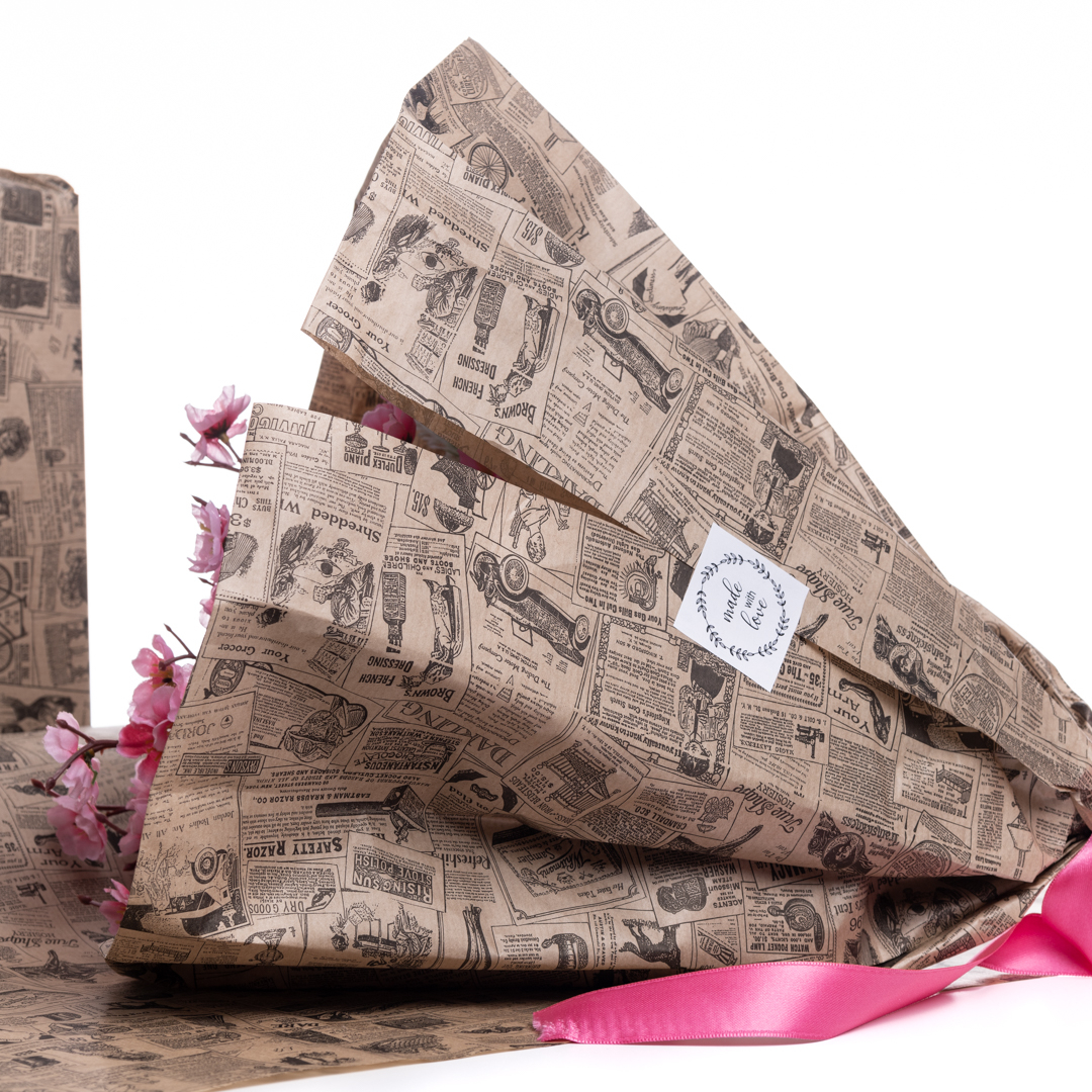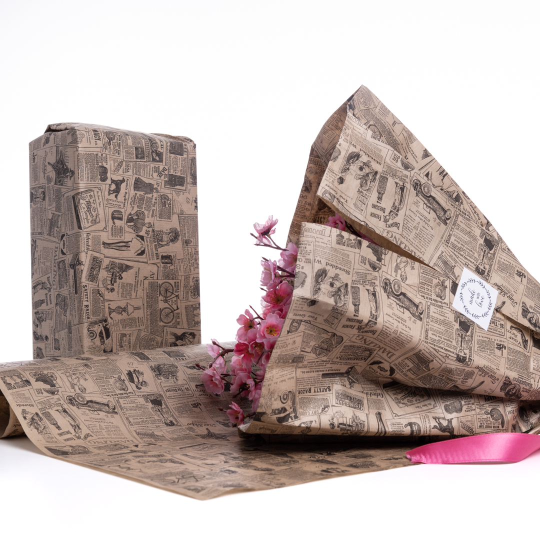 Gelince Haber VerAmbalaj, Paket Kağıdı, 70x100 cm Vintage Gazete Desenli, Kraft-Siyah.