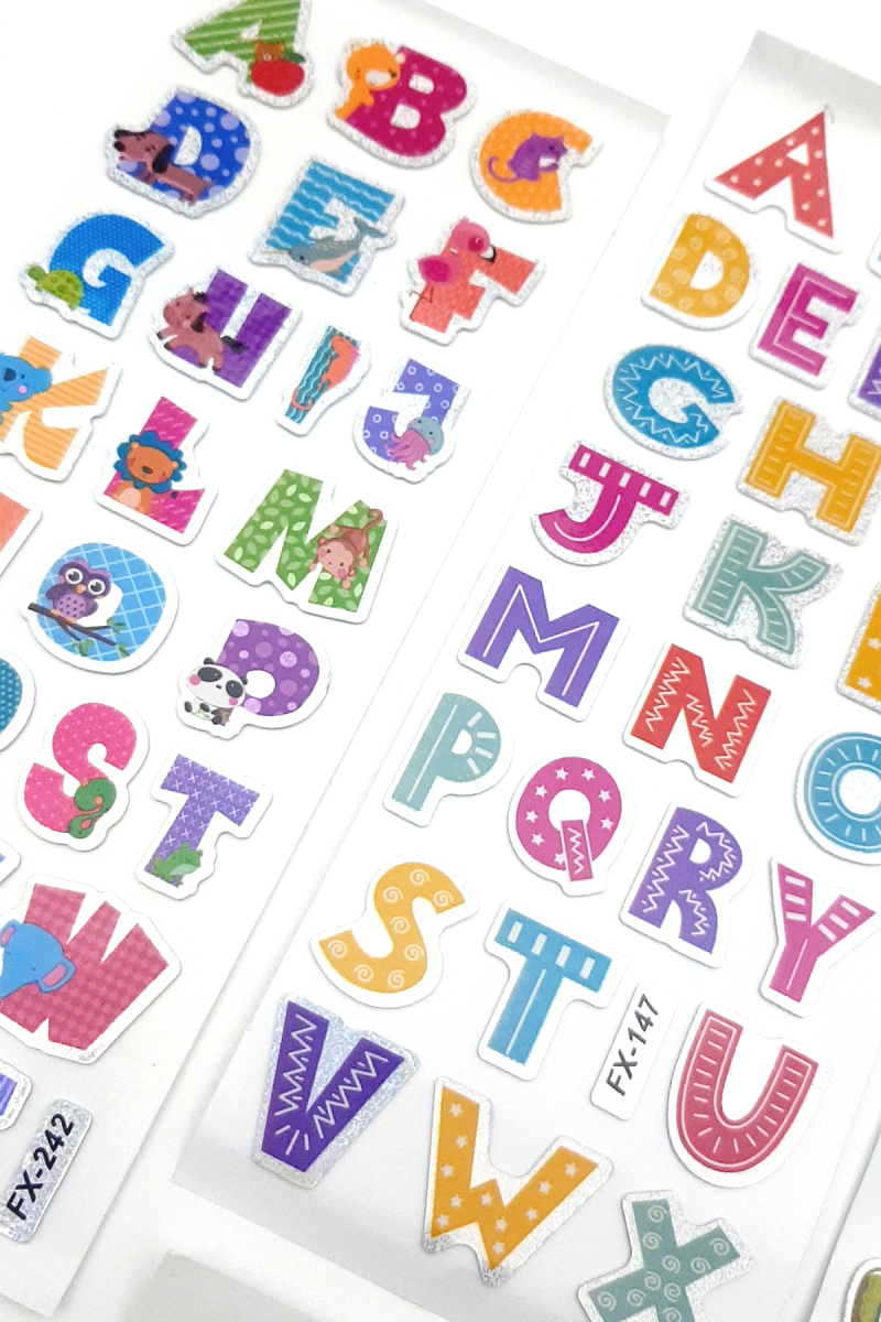 6 adet kabartmalı yapışkan sticker, renkli figürlü alfabe seti