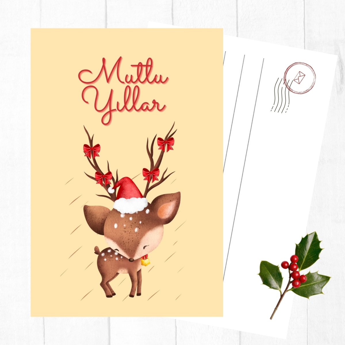 6lı Yılbaşı kartpostal seti, kırmızı şapkalı geyik
