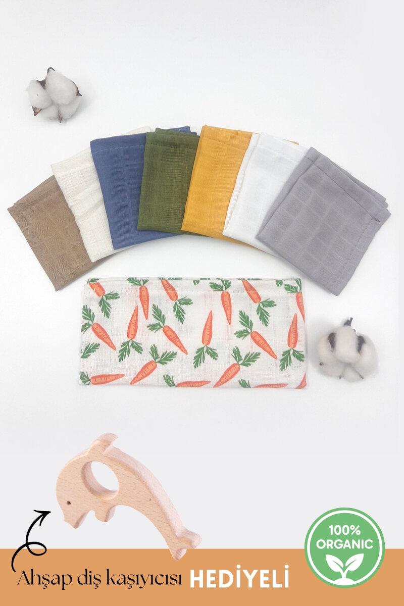 8li organik müslin erkek bebek salya mendili, 25x25 cm ( Ahşap Diş Kaşıyıcısı HEDİYELİ)