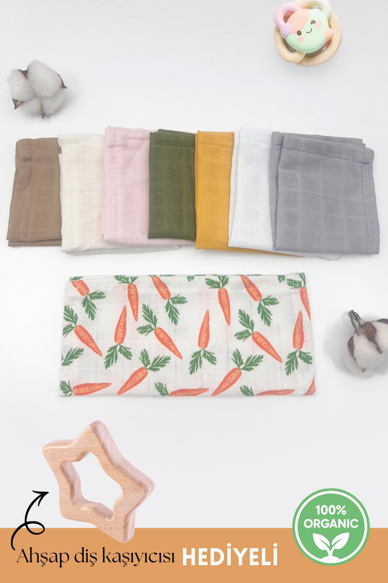 Organik müslin bezinden üretilmiş, 25x25 cm bebek salya önlüğü seti. Tüm bebekler için kullanılabilir. Fiyat 8 adet ürün içindir. 1 adet ahşap diş kaşıyıcı ücretsiz olarak hediye gönderilir. Diş kaşıyıcısının modeli stok durumuna göre değişiklik gösterebilir. Ürün %100 organik pamuktur. Bebeğinizi temiz, kuru ve rahat tutmanıza yardımcı olacak emici yakalık özellikle diş çıkarma döneminde kullanım rahatlığı sağlamaktadır. 30 derecede, ağartıcı kullanmadan hassas yıkama yapılması ve düşük ısıda ütülenmesi önerilmektedir. Kuru temizlemeye uygun değildir.
