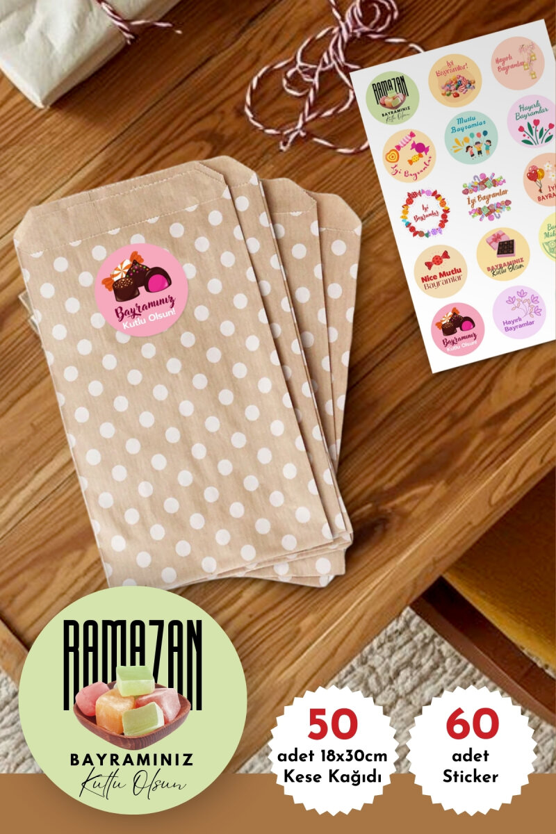 Bayrama Özel Büyük Boy Hediye Seti, 50li kese kağıdı (18x30cm), 60 adet İyi Bayramlar Sticker (4cm)
