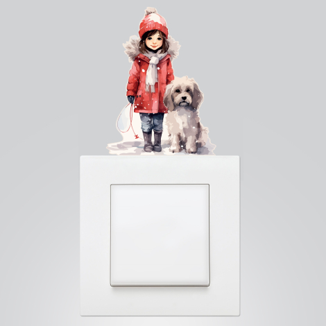 Yılbaşı priz sticker 9x12 cm, Kız Çocuğu ve Köpek / 5 adet