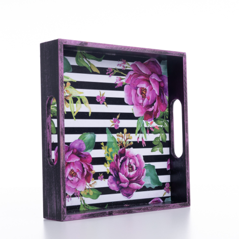 Decorative ornamental tray, 20x4x20 cm, Pink Flower and Line. Digital print on handmade wooden tray.
