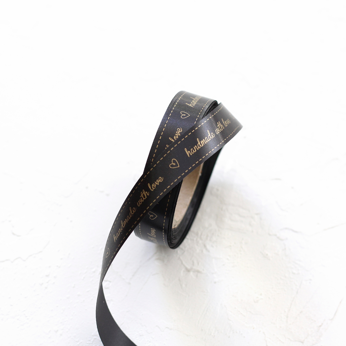 Saten şerit, altın baskılı handmade with love , 1.5 cm / 5 metre / Siyah