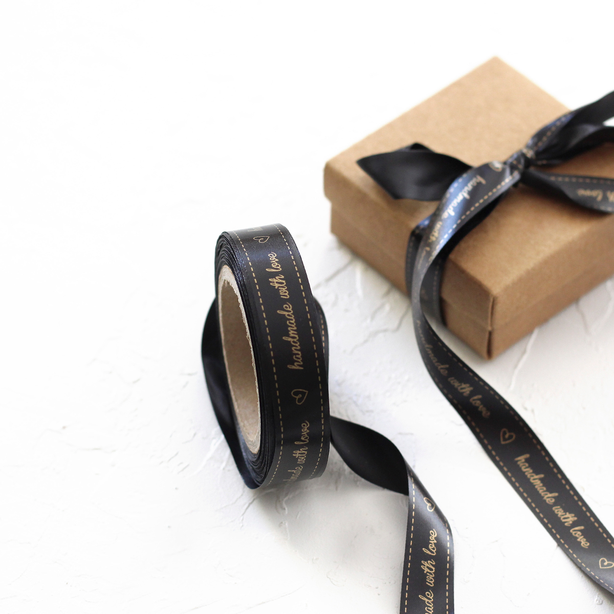 Altın "handmade with love" baskılı siyah saten şerit. Ürünün eni 1.5 cm'dir. Fiyat 5 metre şerit içindir. Bu ürünü butik ürünlerinizi süslemede ve hediyelerinizi paketlemede kullanabilirsiniz.